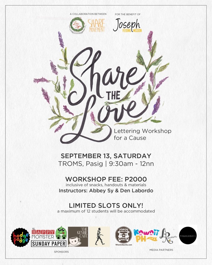 Share the Love is a collaboration between the Love, Type team (Abbey Sy, Den & Steff Labordo) who has facilitated its first workshop last February 15 and Share Movement (Jam Pangilinan) who has organized different workshops for a cause. This upcoming workshop they are organizing for the benefit of Joseph Feeding Mission.