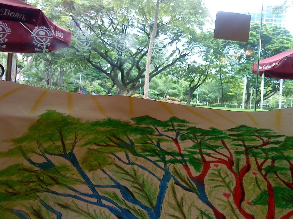 Ta-da! My finished tree inspired by the Philippine Flag color. I added some pillars with words like commandments on tablets. It took me almost 3 hrs to finish everything. Imagine the size of the paper which is 17×22 inches! My hands are so tired and we ate a late lunch at 2:30pm. I use oil pastel and color pencil for this piece.