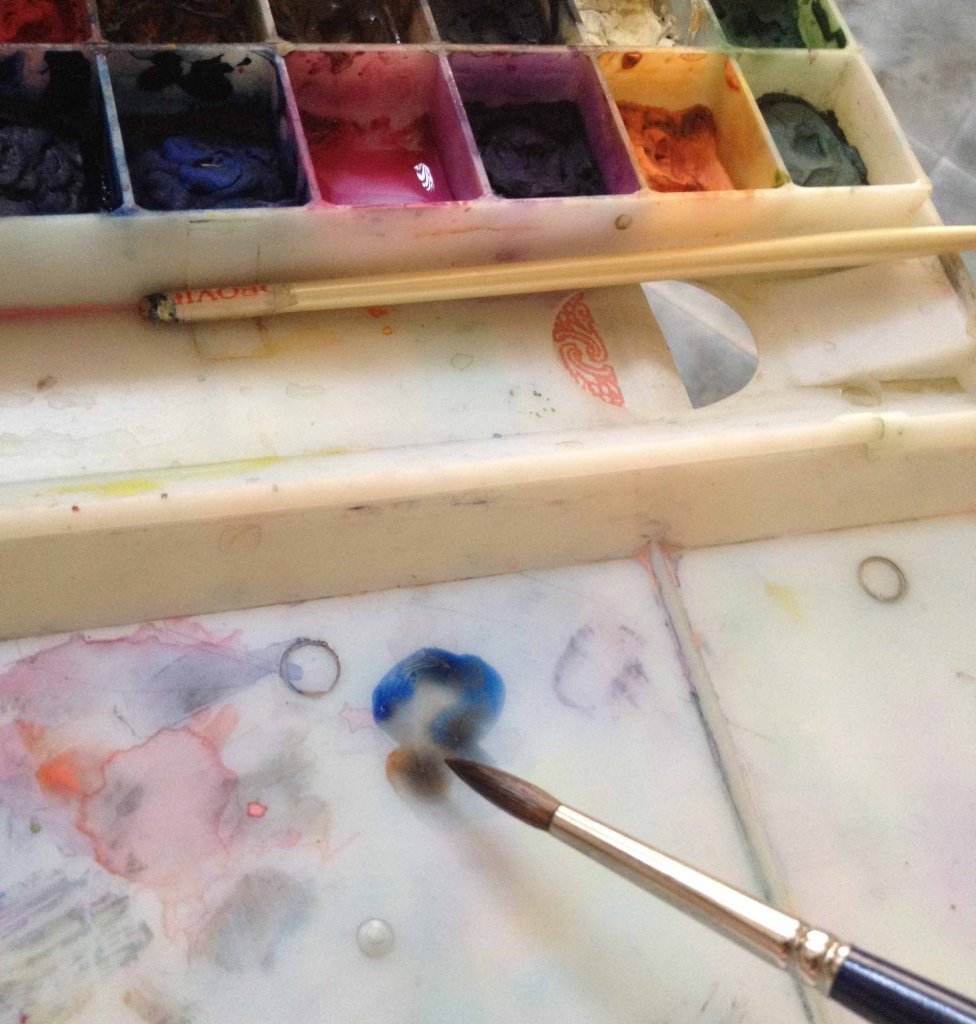 1. After a rough sketch has been done, the cobalt blue and burnt sienna are dabbed on the palette and slightly mixed. These are the colors that were most used.