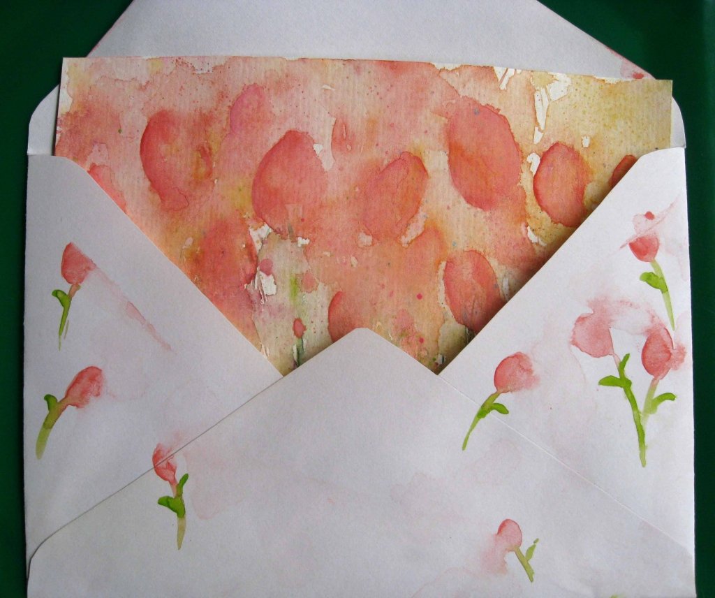 This mail art is entitled Tulips Overflow. The medium behind the work on the handmade envelope and postcard is watercolor. I love to use watercolor to portray the things that inspires me into a loose and colorful adventure.