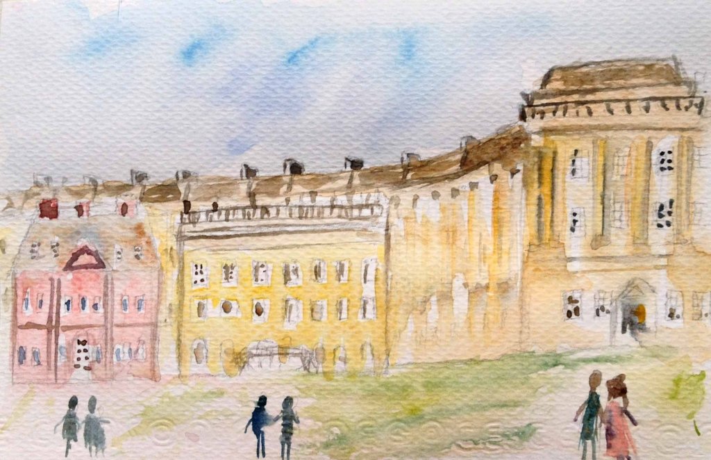 Royal Bath Crescent is an unusual structure. It looks a bit longer in the actual but the paper wasn’t long enough to accommodate the length of it. I painted this last and allowed myself to go loose with it. I really like the contrast of the light and dark and would like to thank my client for telling me to add more darks. The windows and the left corner of the building is painted without much detail leaving just the white of the paper which I think makes this painting sparkle. I like how the huge grassy field brings a nice contrast against the details of the architecture.