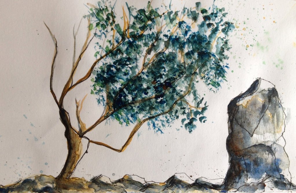 It was a windy day when I sketched this almost bare tree. It was about to rain and the sky was gloomy. I sketched quickly feeling the wind on my face and hair. I like how the thin tree stood amidst the rocks and inches away from the boulder.