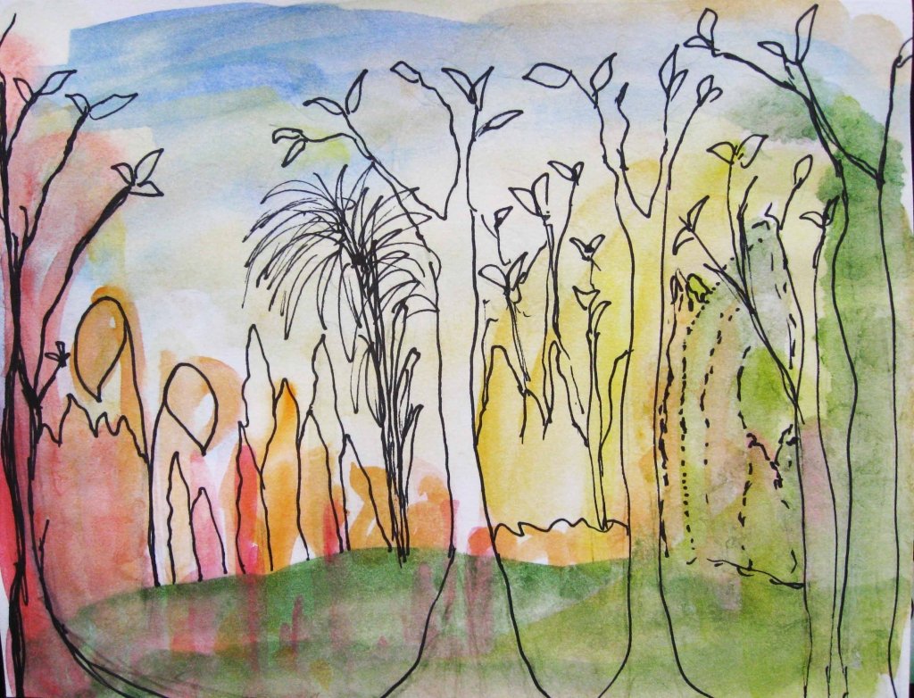 It’s been 2 days or so since I last painted. And I sat down today trying to work on a card that we will giving to our World Vision sponsored child, Chen-Chen who has just graduated recently from Elementary. Without any idea at first I painted away with colors. Then I added line ink trees. Below is the finished card. I love it.