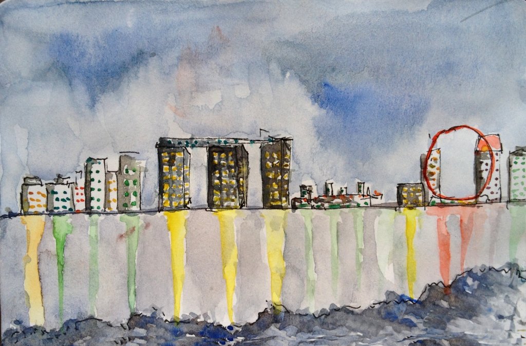 I rarely paint a night scenery. I was thinking how I can proceed because all I can think of is the black color. But in watercolor I find that it is helpful to leave the white of the paper as light instead of painting the whole of the buildings in black. There must be a contrast between the dark and light colors. Hope to experiment and learn more as I practice.