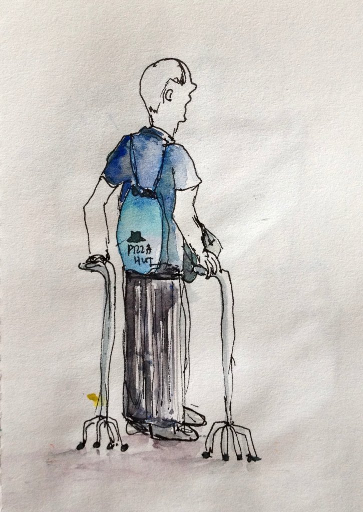 I saw him again on my way to work and had to quickly sketched him. He lived across from the bus stop, carrying his blue drawstring knapsack along with a belt bag and would slowly inch his way accompanied by his two four-legged canes. He inspires me. At his old age he still goes to work despite his condition. He always entered last in the bus and would go down at the first stop. I have no idea what his work is. I wonder if he experiences any pain or discomfort while walking…