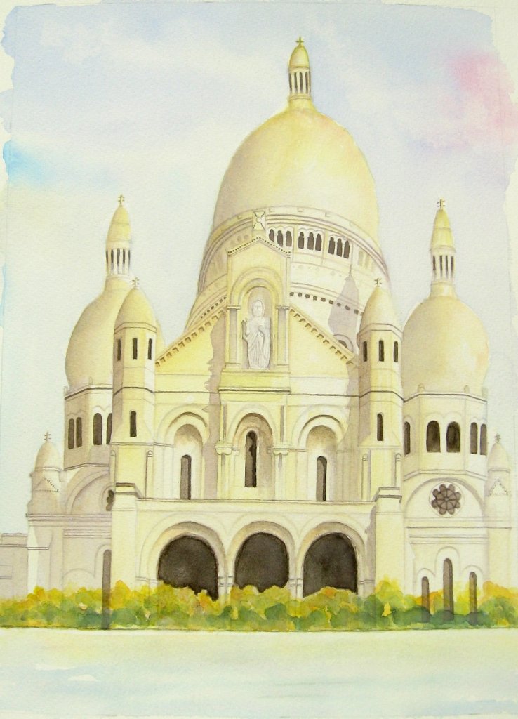 A second round of approval and I am on my way to start painting. I created a diluted wash of Cobalt Blue and Phtalo Blue with touches of Yellow Ochre and Permanent Rose for the skies. However, I made a mess with the sky of the Eiffel Tower that I had no choice but to redo everything though thankfully with the aid of tracing paper which made my life a bit easier. For the landmarks I always start with an under painting and I prefer golden colors of mixed Yellow Ochre and Light Yellow with lots of water to set a light tone. Then I layer a mix of Yellow Ochre and Burnt Sienna wash for the darker tone. I continue to build on layers using the first two washes as needed.