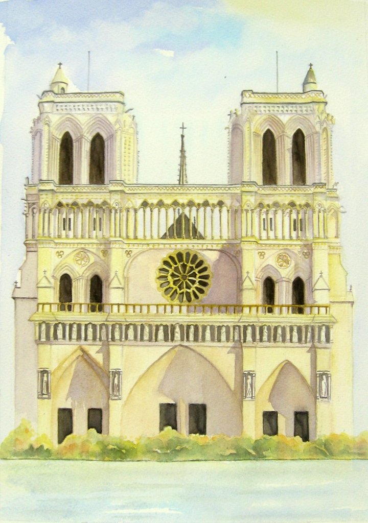 After it was approved, I prepared three sheets of 12″ W x 16″ H watercolor paper and laid down the margins on all sides and draw a line for the River Seine using a HB pencil and ruler. I feel like an architect drafting these structures and measuring everything to achieve balance. This process is a tough one and many patience is needed in order to get it right.