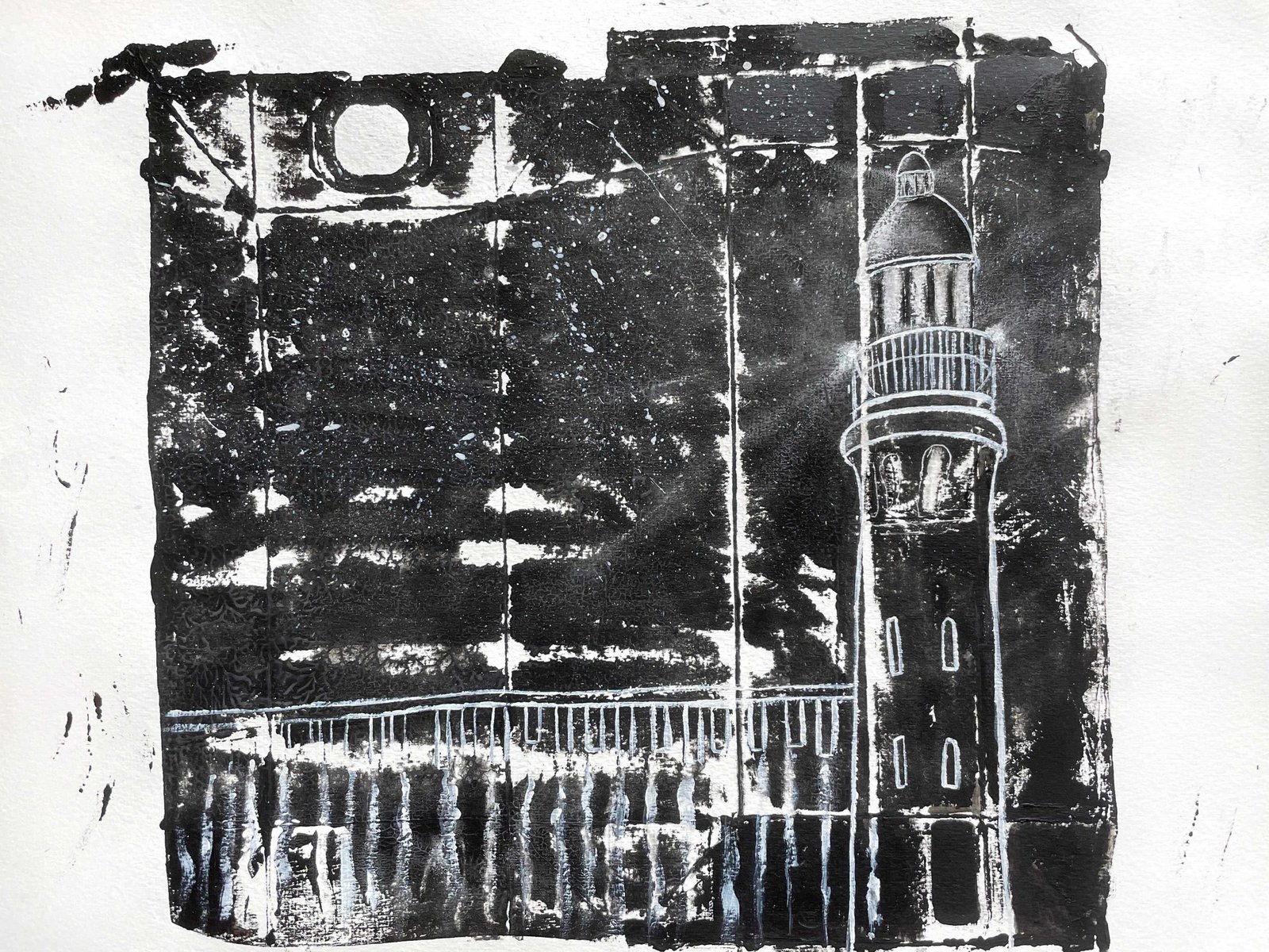 I applied block printing ink on the surface of the milk tetrapak then made a print. Once dried, I used white paint to draw the lighthouse and used white soft pastel to create the light.