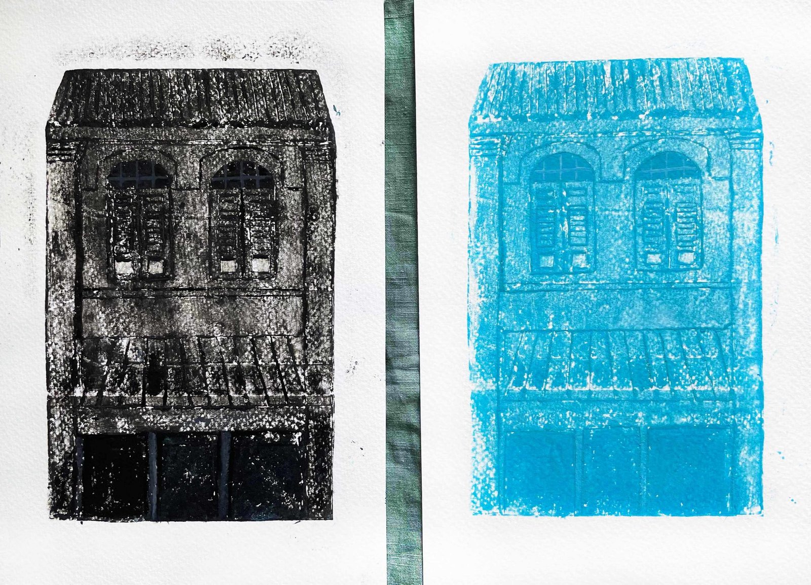 The old and charming shophouse was my inspiration for these prints. I drew the shophouse on tracing paper then transferred it onto milk tetrapak. I used an awl to create incisions on the drawing, then used a blade to peel away some of the areas that I wanted darker. The sunken areas hold the ink.
