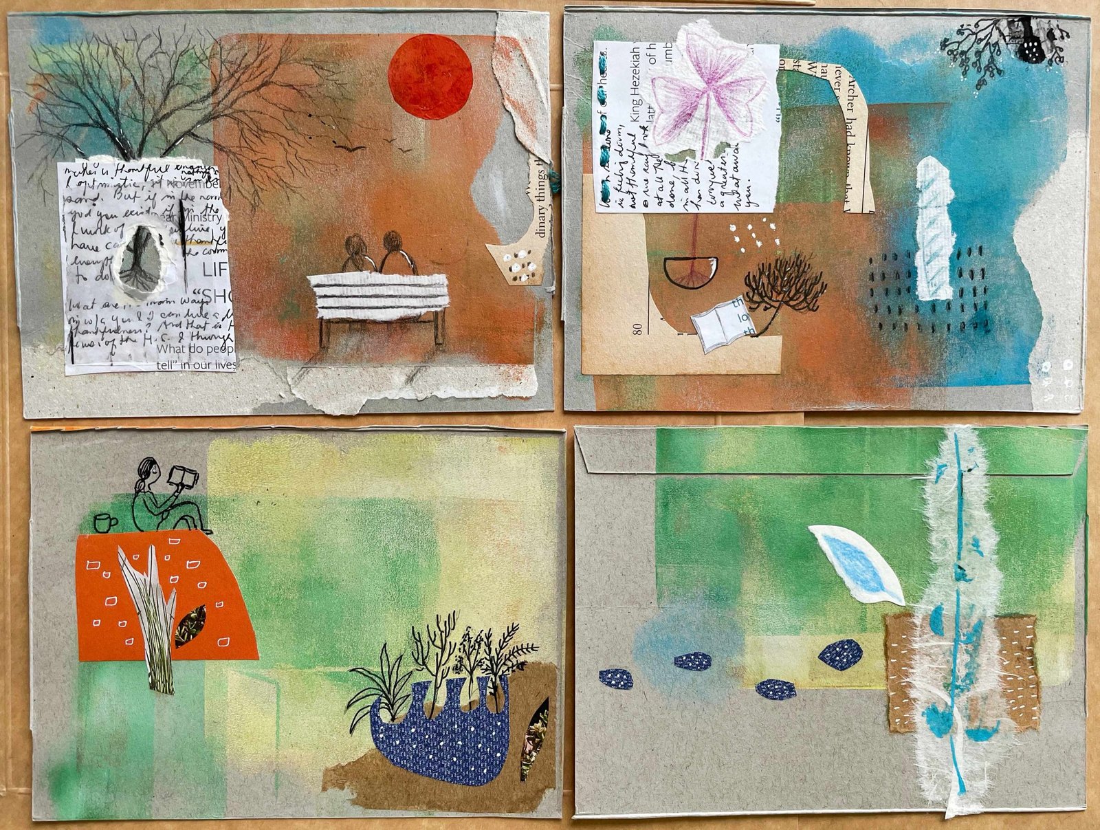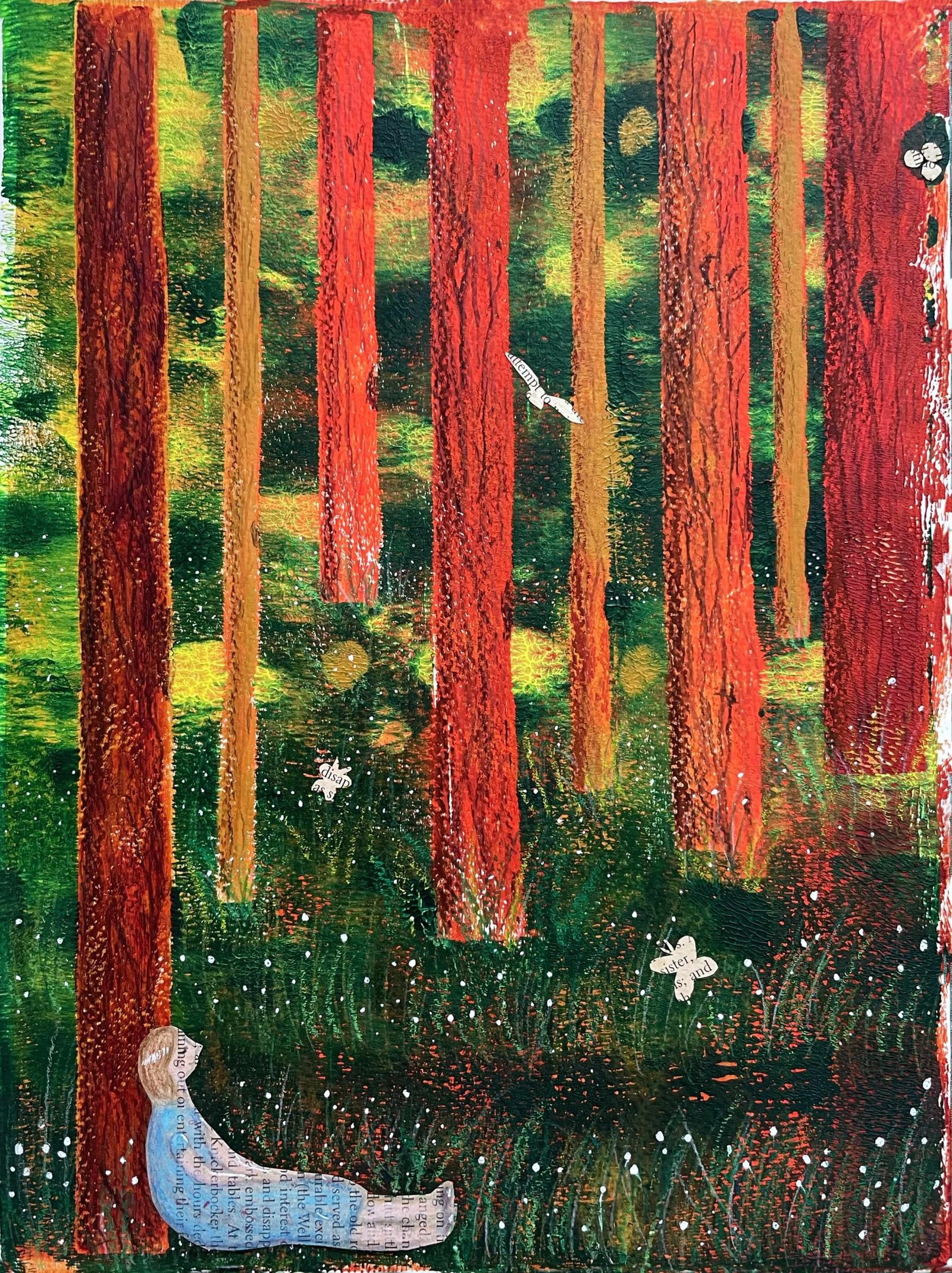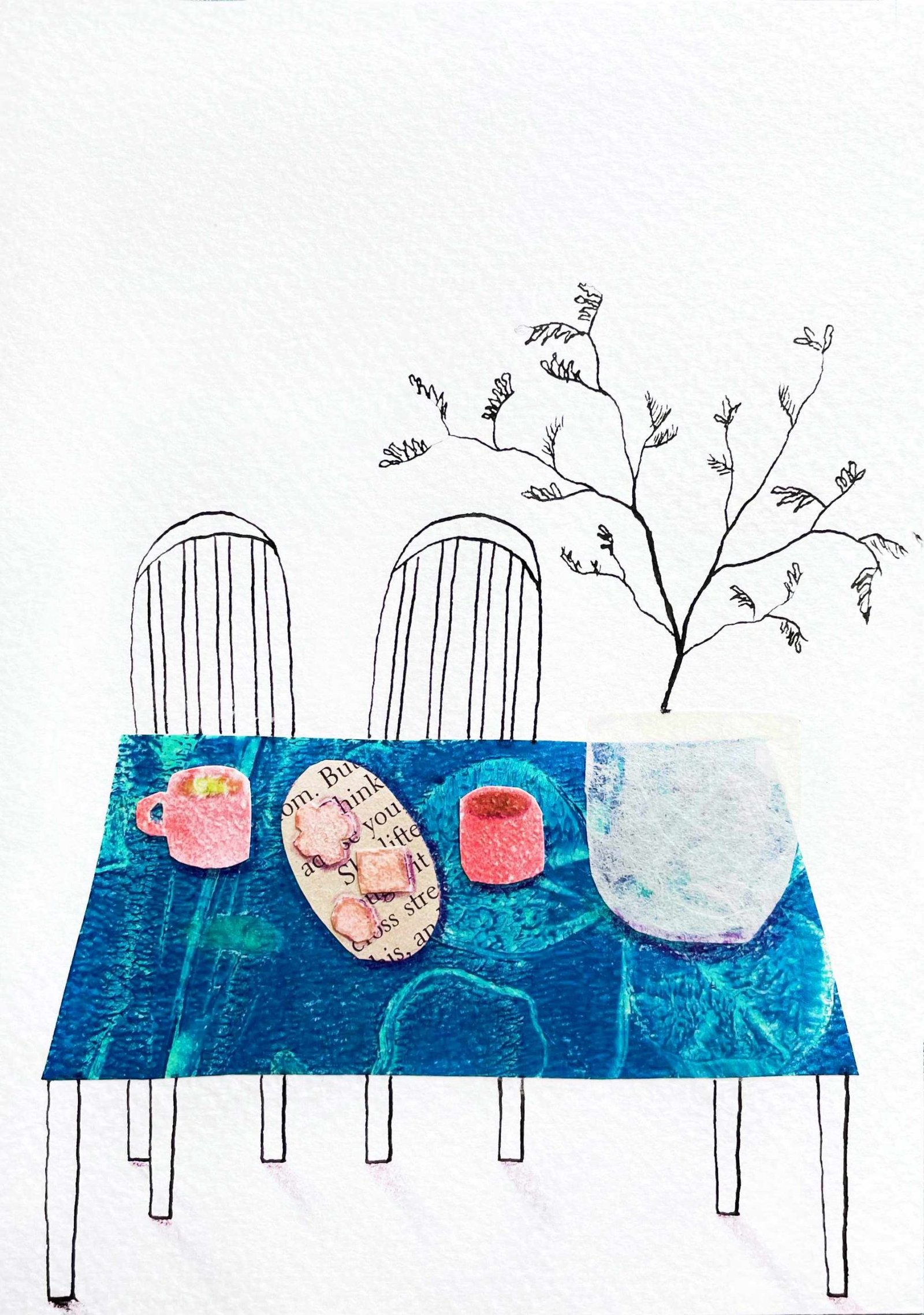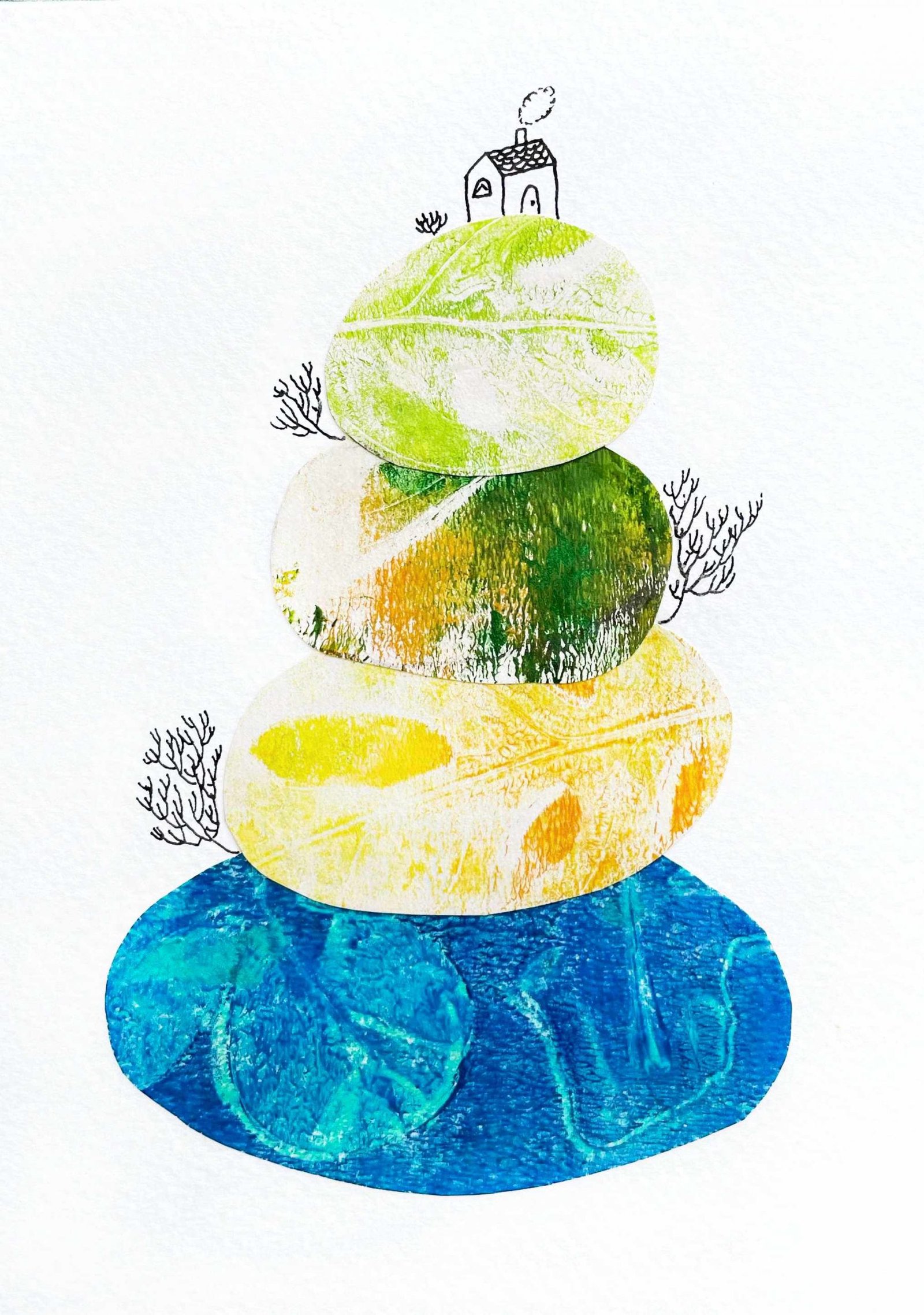 I placed watercolor paper offcuts on the printing plate with acrylic paints to print the trunks. I also used old pages of a book to collage my illustrations.