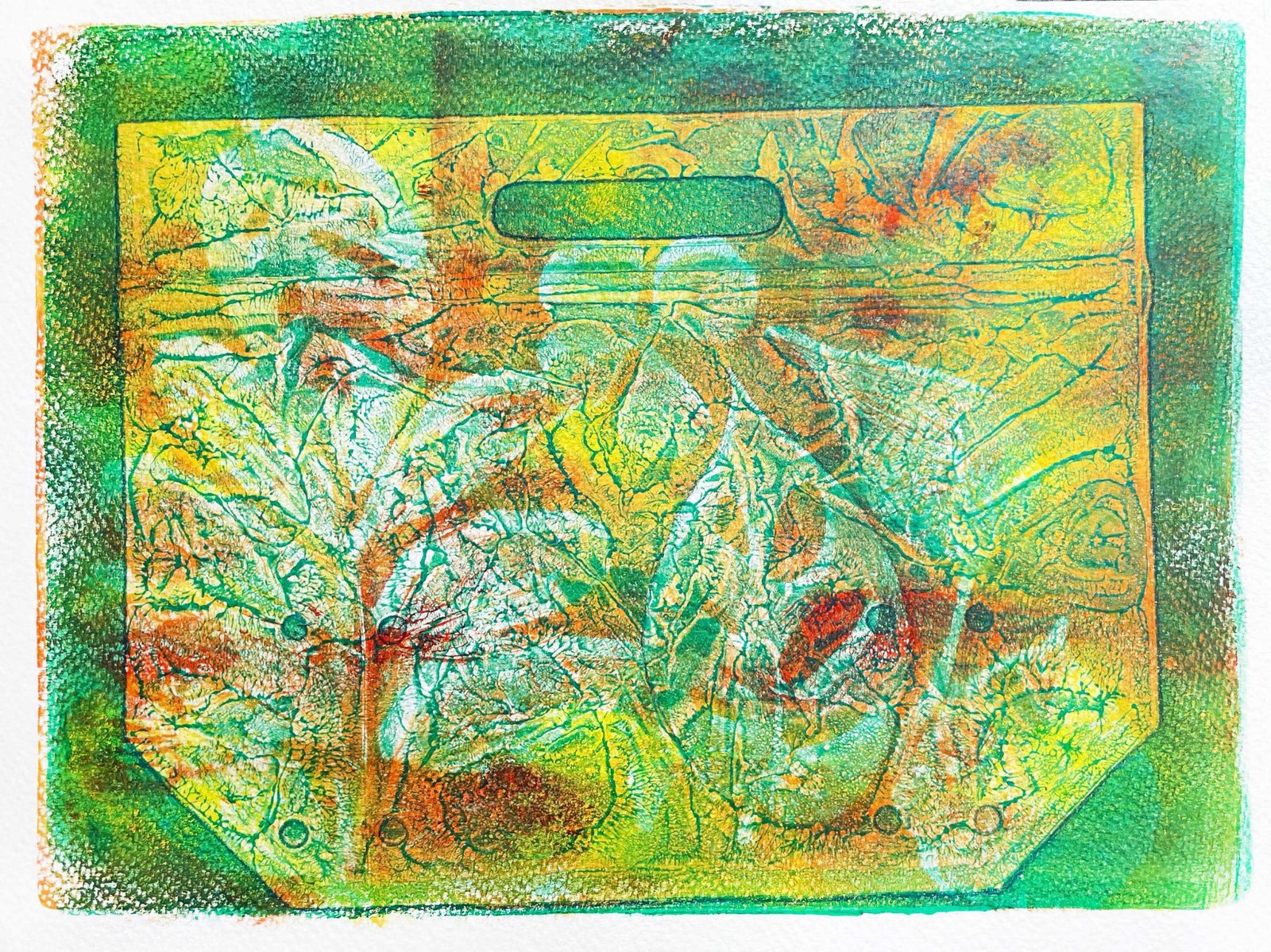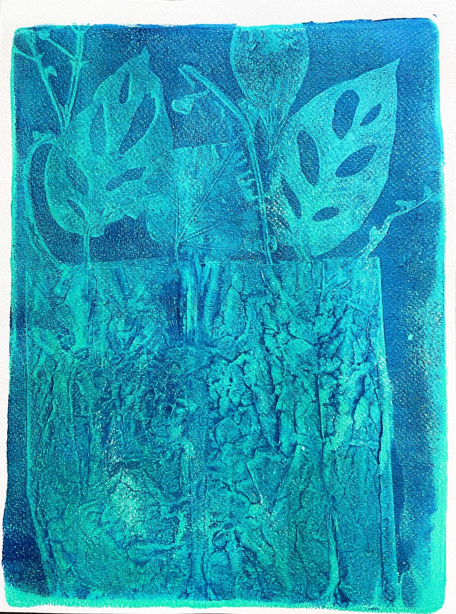I used three different hues of blues to print a multi-layered water scene using the insides of an oats packaging.