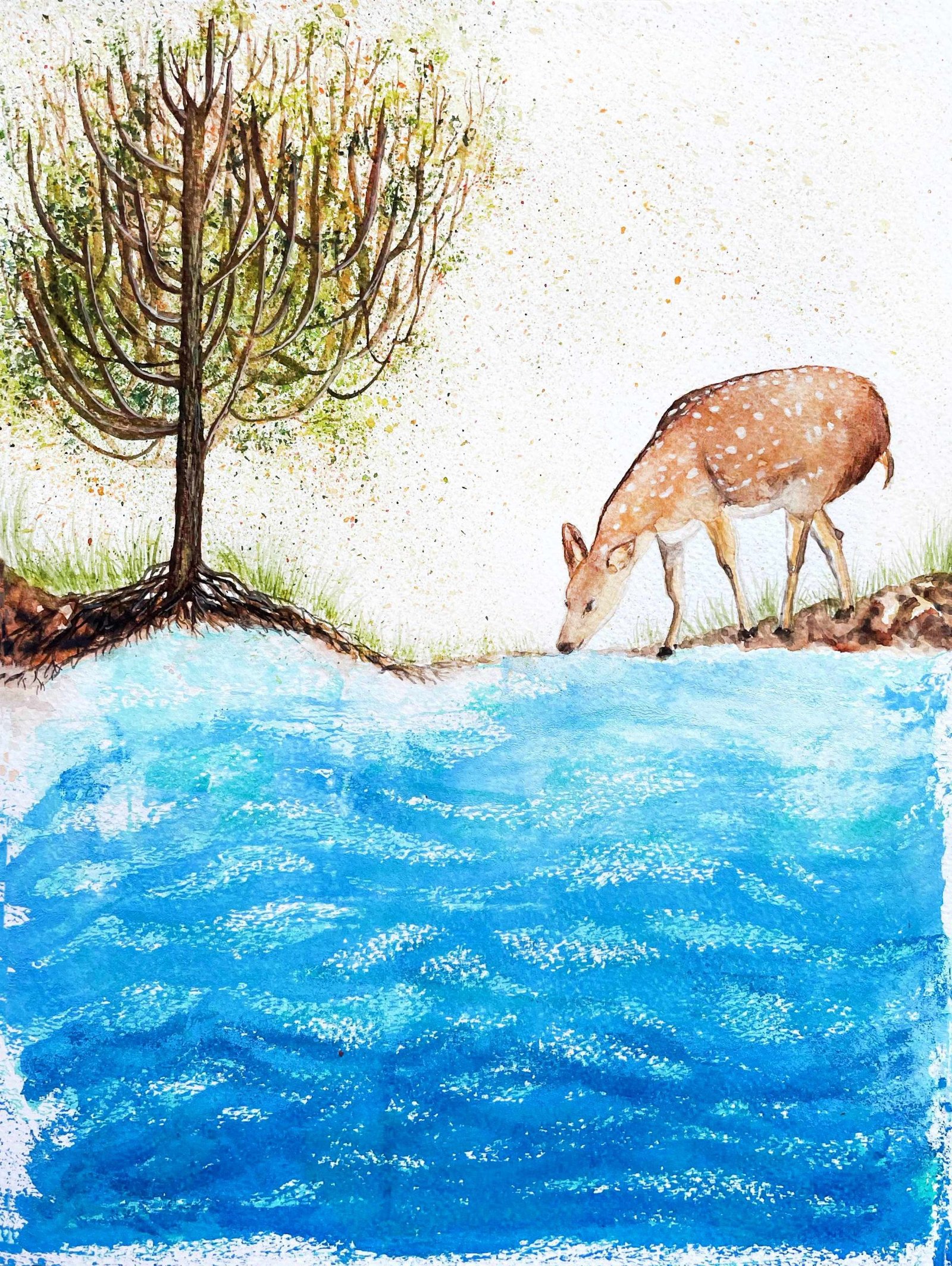 Inspired by the Psalm, the stream provides nourishment to the tree (Psalm 1:3) and it refreshes the thirst of the deer (Psalm 42:1).