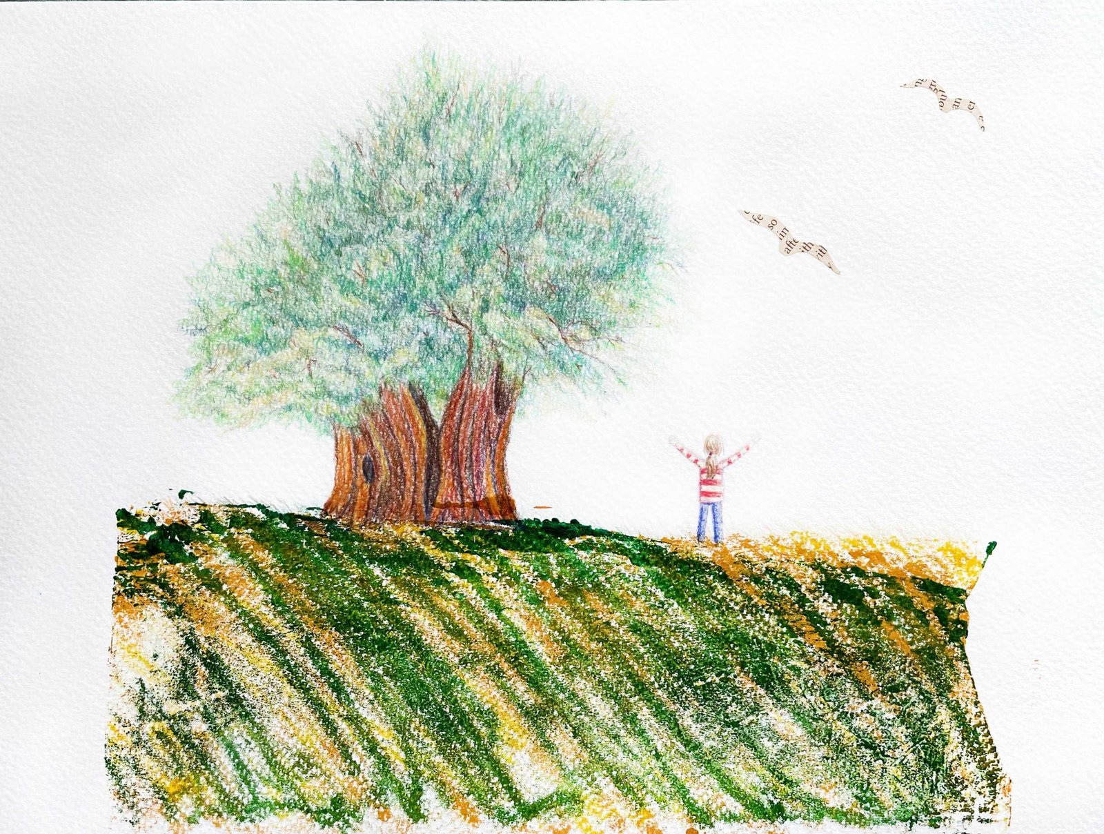 I used the inside of the oat packaging to create the landscape. As I layered each color, I moved my arm in a sweeping motion to create grass blowing against the wind.