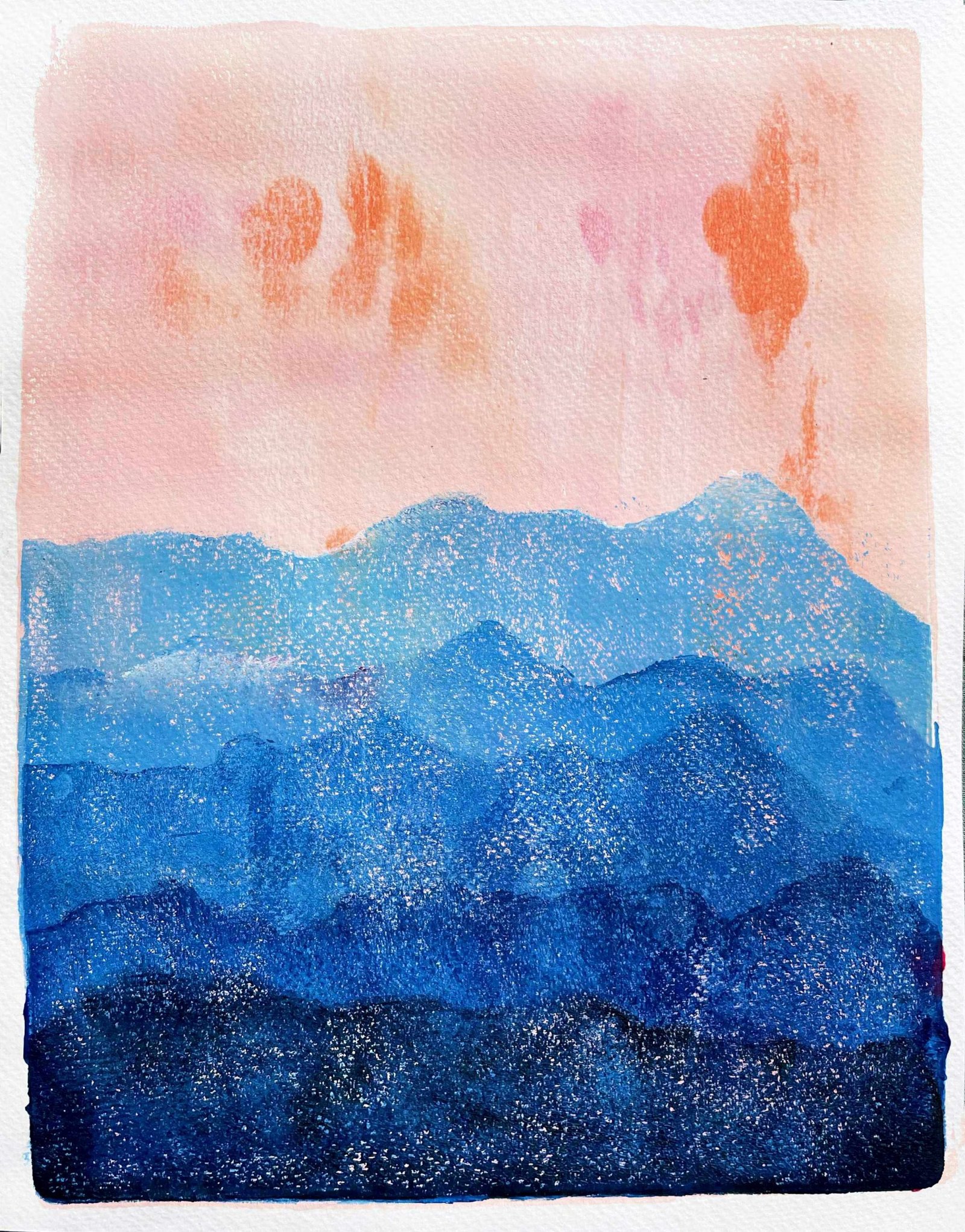 I drew the rocky edges of the mountain on offcuts watercolor paper. I used them as stencils to print the mountains in different tones of blue.