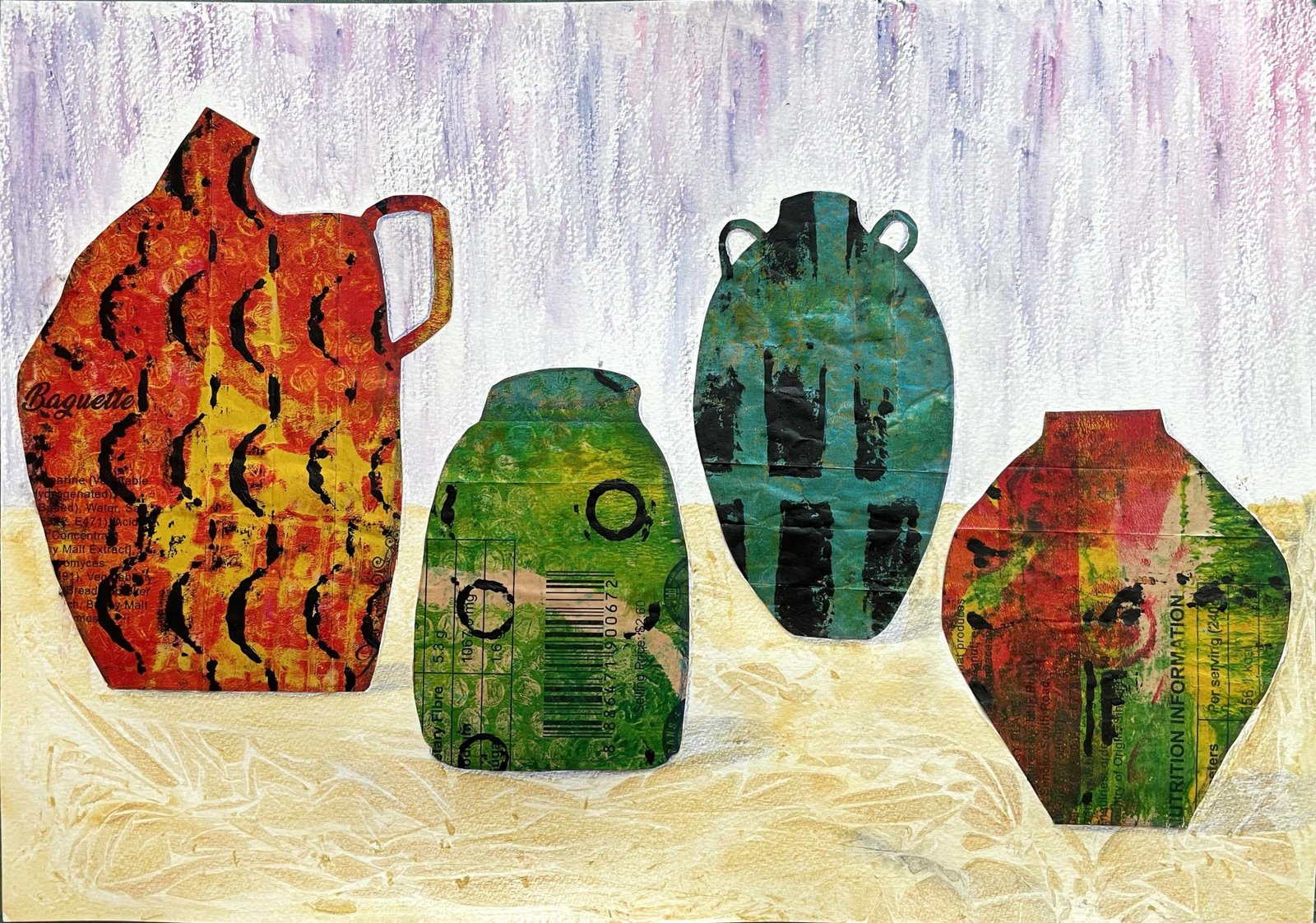 I used the raised surfaces of a plastic egg tray and a plastic fruit container to print the patterns on bread packaging. I drew and created a collage of the different vessels